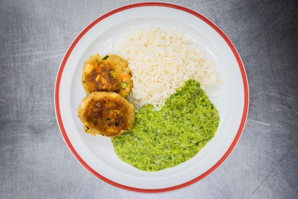 Für die Spinatrahmsauce: Den gehackten Spinat in Brühe und Sahne weich dünsten. Mit Salz, Muskat und Kurkuma würzen. Mit Stärke abbinden und zu dem fertigen Bratling mit dem gekochten Reis geben.