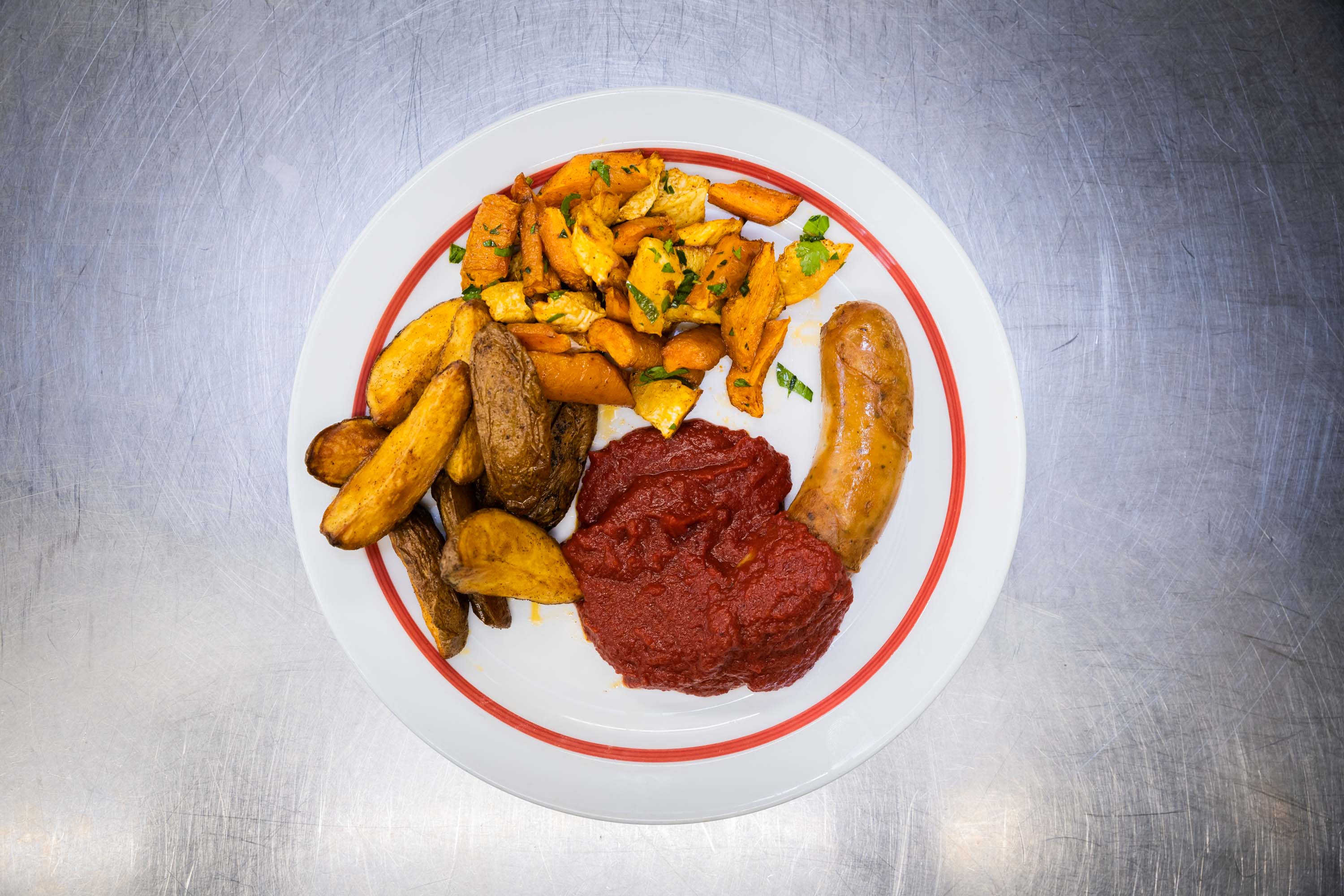 Röstgemüse: Kürbis in Spalten schneiden mit Öl und Salz, Muskat und gemahlenem Fenchel würzen. In einer Pfanne rösten (Achtung gart schnell durch). Am Ende mit frischer gehackter Petersilie vermengen.