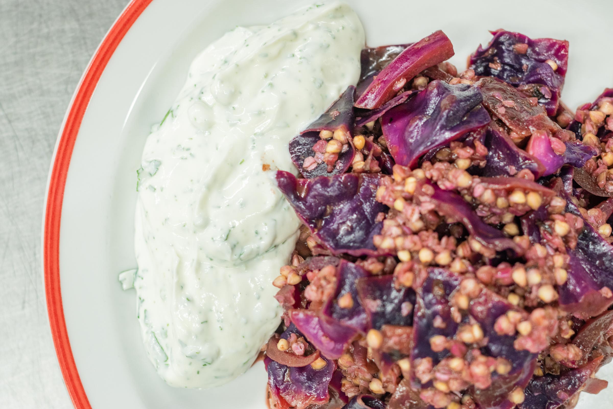 Die Roten Bete mit der Schale weichkochen. Gerne kann man ganzen Kümmel hinzugeben, das gibt nicht nur Geschmack, sondern reguliert auch die Darmflora. Nach dem Kochen (ca. 50 min) die Schale entfernen und die Roten Bete in Würfel schneiden. In einer Pfanne mit wenig Öl anrösten und mit Salz und Pfeffer sowie gemahlener Fenchelsaat würzen.