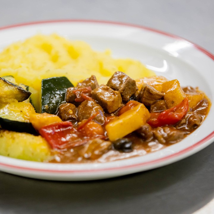 Zucchini in mundgerechte Stücke schneiden, mit Olivenöl, Salz, Pfeffer und Thymian marinieren, in einer heißen Pfanne kurz anbraten und zum Gulasch und dem Kartoffelstampf servieren.