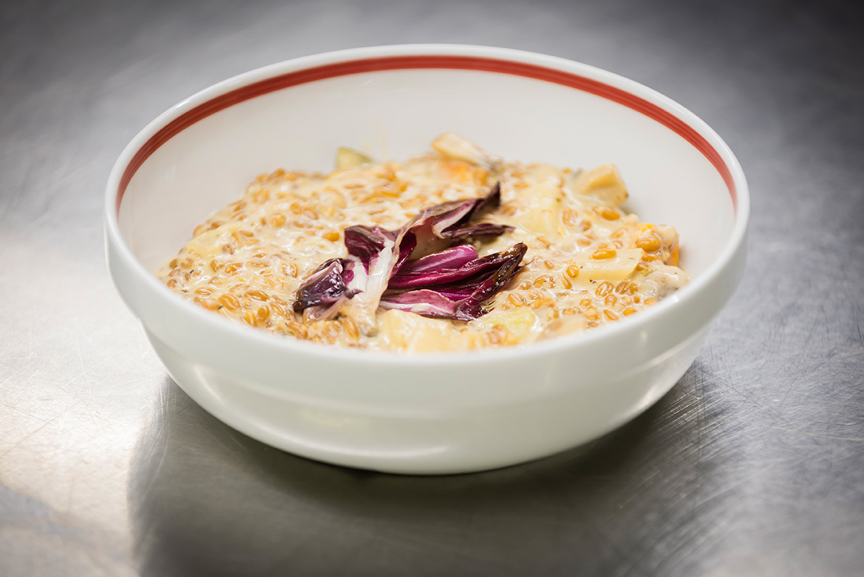 Dinkel kann wie Risotto-Reis verwendet werden (also nicht über Nacht einweichen). Für einen nussigen Geschmack zunächst den Dinkel in Pflanzenöl anrösten, die Zwiebelwürfel hinzugeben, mit der Brühe aufgießen und leicht kochen lassen bis der Dinkel fast gar ist. Karotten und Sellerie in Würfel schneiden und in einer Pfanne anrösten. Lauch in halbe Ringe (oder Zucchini in Scheiben) schneiden und gut waschen. Karotte und Sellerie zur Dinkel-Zwiebel-Mischung geben und mit Sahne aufgießen. Kurz vor dem Ende den Lauch hinzugeben und garen. Je nach Saison und Geschmack Pilze auswählen, anbraten und in oder auf das fertige Dinkel Risotto geben. Frischer gehackter Kerbel passt am besten dazu (alternativ Radicchio oder Chicoree).