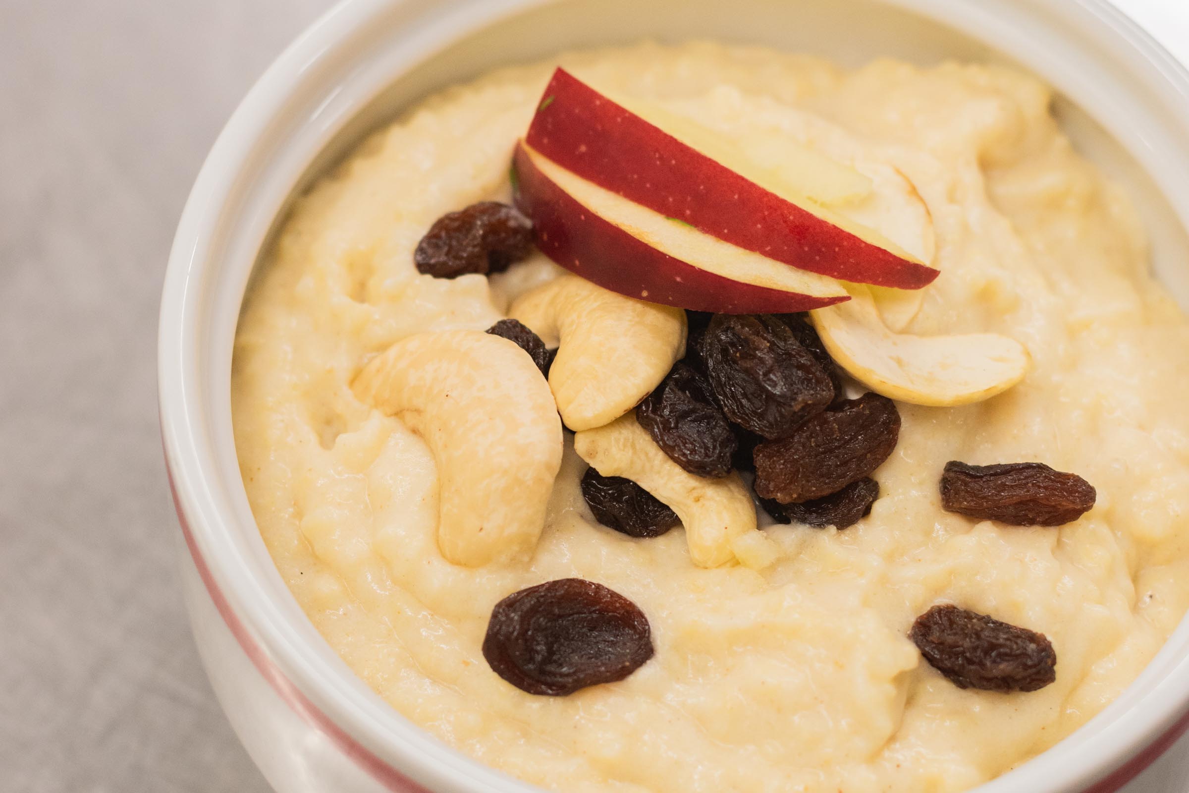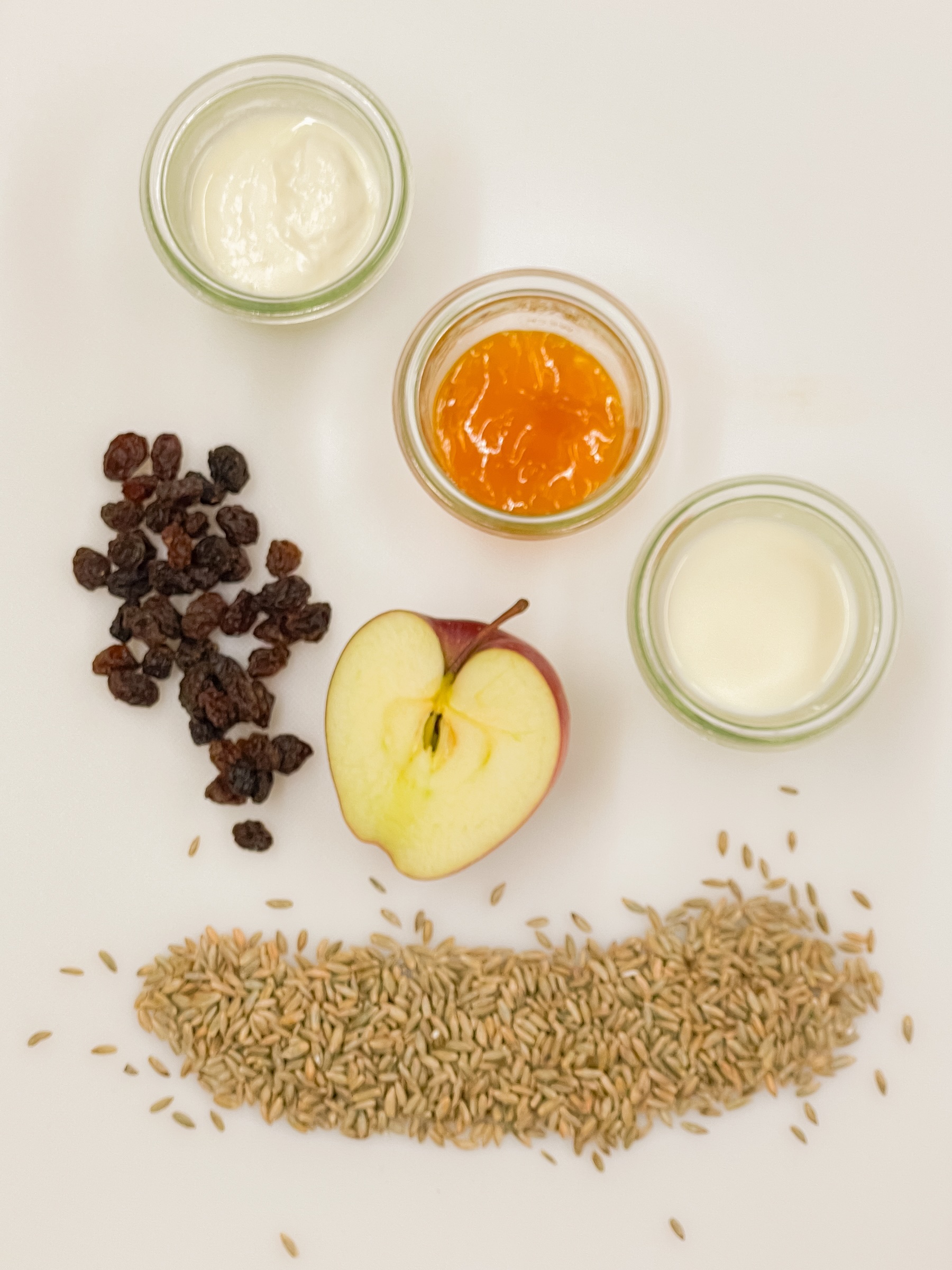 Passende Gewürze wären Zitronenabrieb, Zimt und Galgant*. Die Süße bekommt man vom Rübenkraut oder Agavendicksaft und der Aprikosenmarmelade. Gerne kann jede andere gelbe Marmelade verwendet werden. Die Rosinen kurz in heißem Wasser quellen lassen und in den Brei geben.