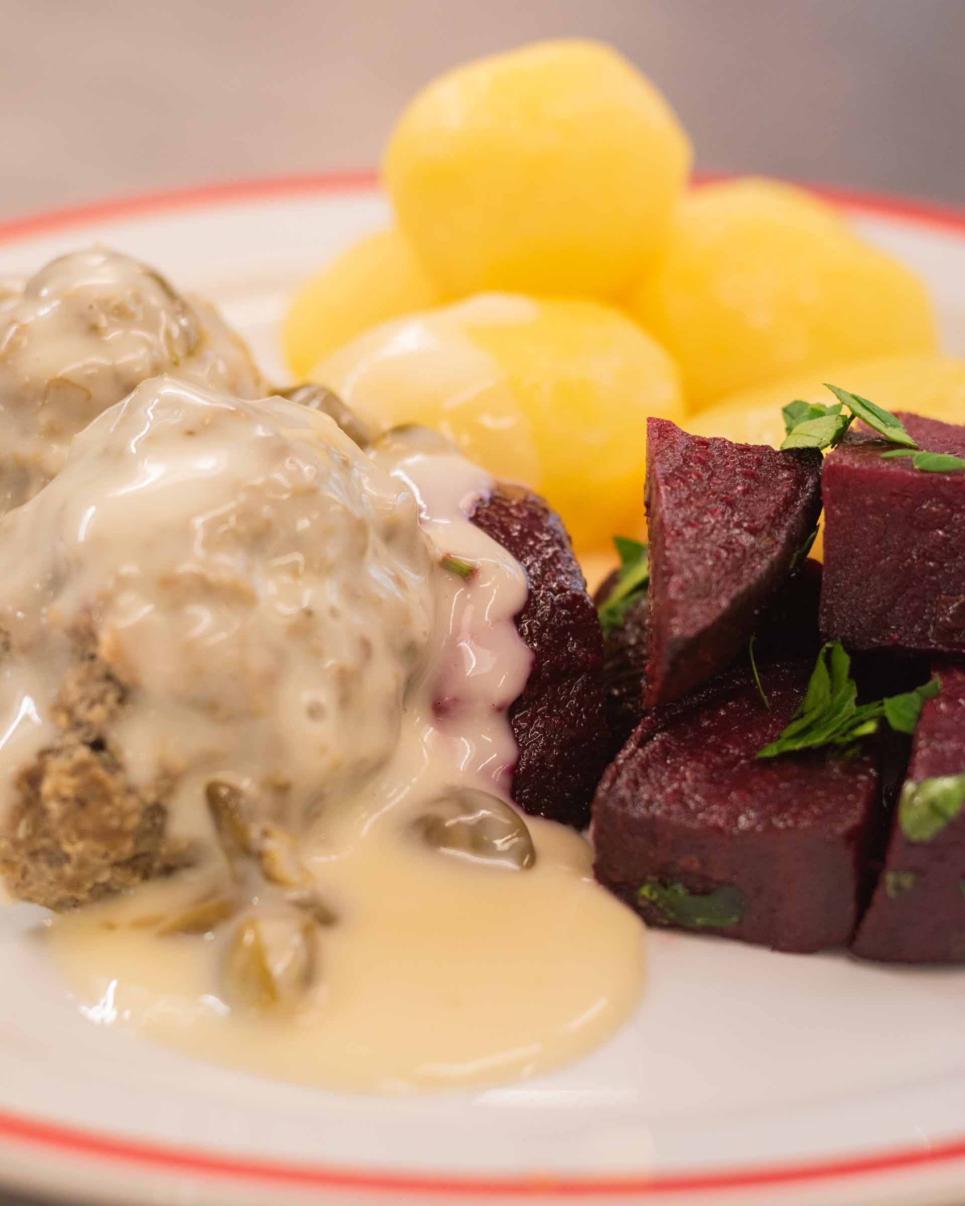 Königsberger Klopse, Salzkartoffeln, gebackene Rote Bete und Kapernsauce