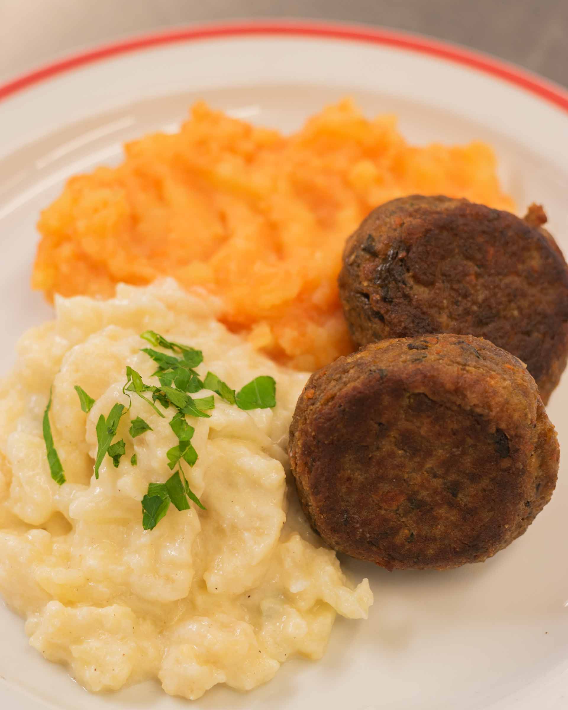 Pilz-Gemüse-Bratling mit Rahmblumenkohl und Karottenstampf