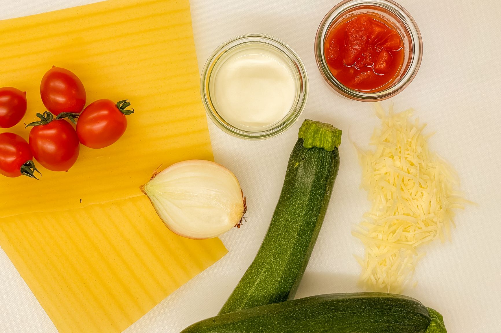 Zucchini, Tomaten und Zwiebeln in halbe Scheiben schneiden und mit der Béchamelsauce und den Gewürzen vermengen.